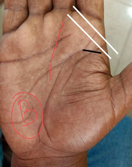 Fate line in plamistry – The Lifepath Line (traditionally called the fate line) is the most difficult major line to locate on the palm. It’s often weak, or it’s only partially present. It begins near the base of the palm and wanders upward, toward the wall digit. Occasionally, it’s absent altogether. Unlike the other major lines, this one often doesn’t develop until after the age of twenty or so when we ‘find ourselves’ and our sense of purpose. When you see a clear, bold Lifepath Line (image -A) , it means a person has established a clear sense of their own character; they have goals and values of their own. This line is strongly associated with the career, as this is a vital aspect of our lifepath. When there isn’t a Lifepath Line visible( image- 2)in someone’s palm, a person never knows what it is they want to be or do.